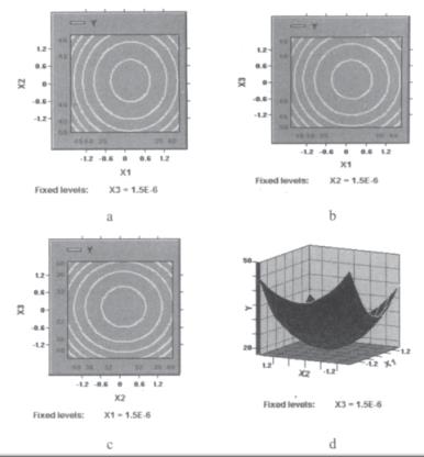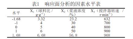 利用響應面分析法[1]化枸杞子渣超微粉碎工藝參數(shù)。在單因素預試驗基礎上,用SAS軟件系統(tǒng)進行響應面分析,設計一個三因素五水平的回歸方程來擬合因素和指標(響應值)之間的函數(shù)關系。選擇球料比(X1)、枸杞子渣漿液濃度(X2)和攪拌器轉速(X3)作為因素,以粉碎后的顆粒粒度d50作為響應值對球磨機濕法超微粉碎工藝進行化。
